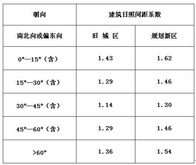 注:東西朝向的建筑其日照間距系數(shù)按上表>60o的日照間距系數(shù)執(zhí)行。